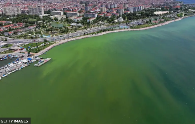 Em Izmir, na Turquia, a cor do oceano mudou para verde e marrom depois da explosão de plâncton em junho de 2024